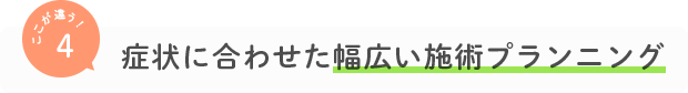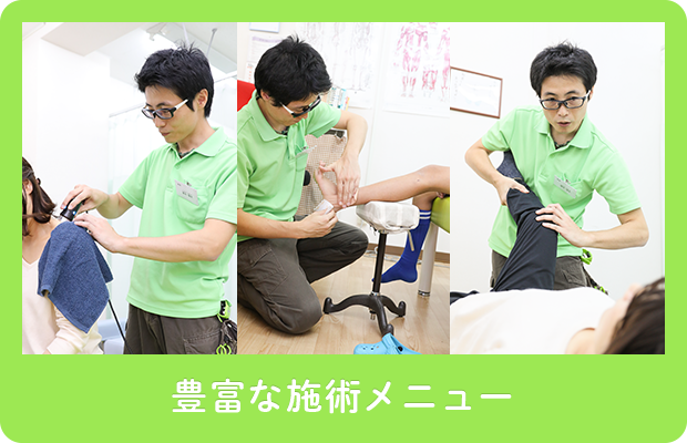豊富な施術メニューであなたの症状に適した施術プランをご提案します。もちろん、押しつけの施術ではなく患者さまのご要望を踏まえた、納得頂けるプランをオーダーメイドしていきます。