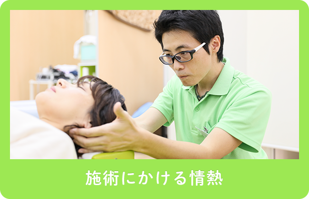 患者様1人1人に初診時から院長が対応し、施術を行っていきます。施術担当者が変わる事がないので、その都度、様々なご相談やお悩みについて気軽にお話し頂けます。また、患者さまの症状やご希望をきちんと把握して施術を行えるところが強みです。